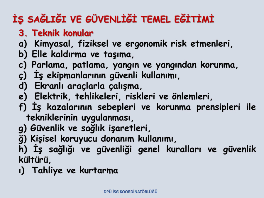 Temel İSG eğitimleri; genel iş sağlığı ve güvenliği kuralları, iş kazalarının nedenleri ve korunma yöntemleri, meslek hastalıkları, acil durumlar, yangın, ilkyardım ve çalışanların yasal hak ve sorumlulukları gibi konuları kapsar.