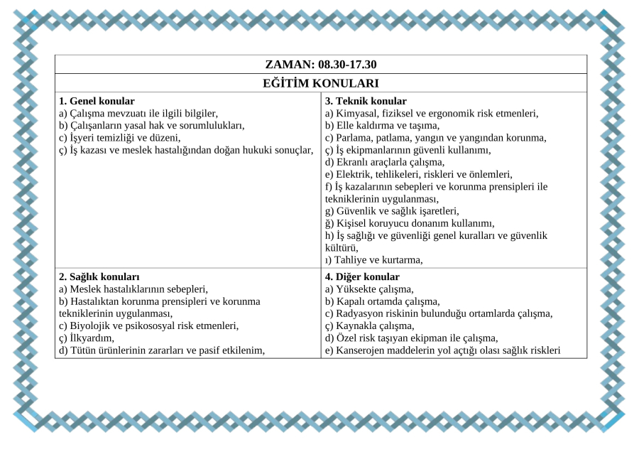 - Az tehlikeli işyerlerinde: En az 3 yılda bir 8 saat